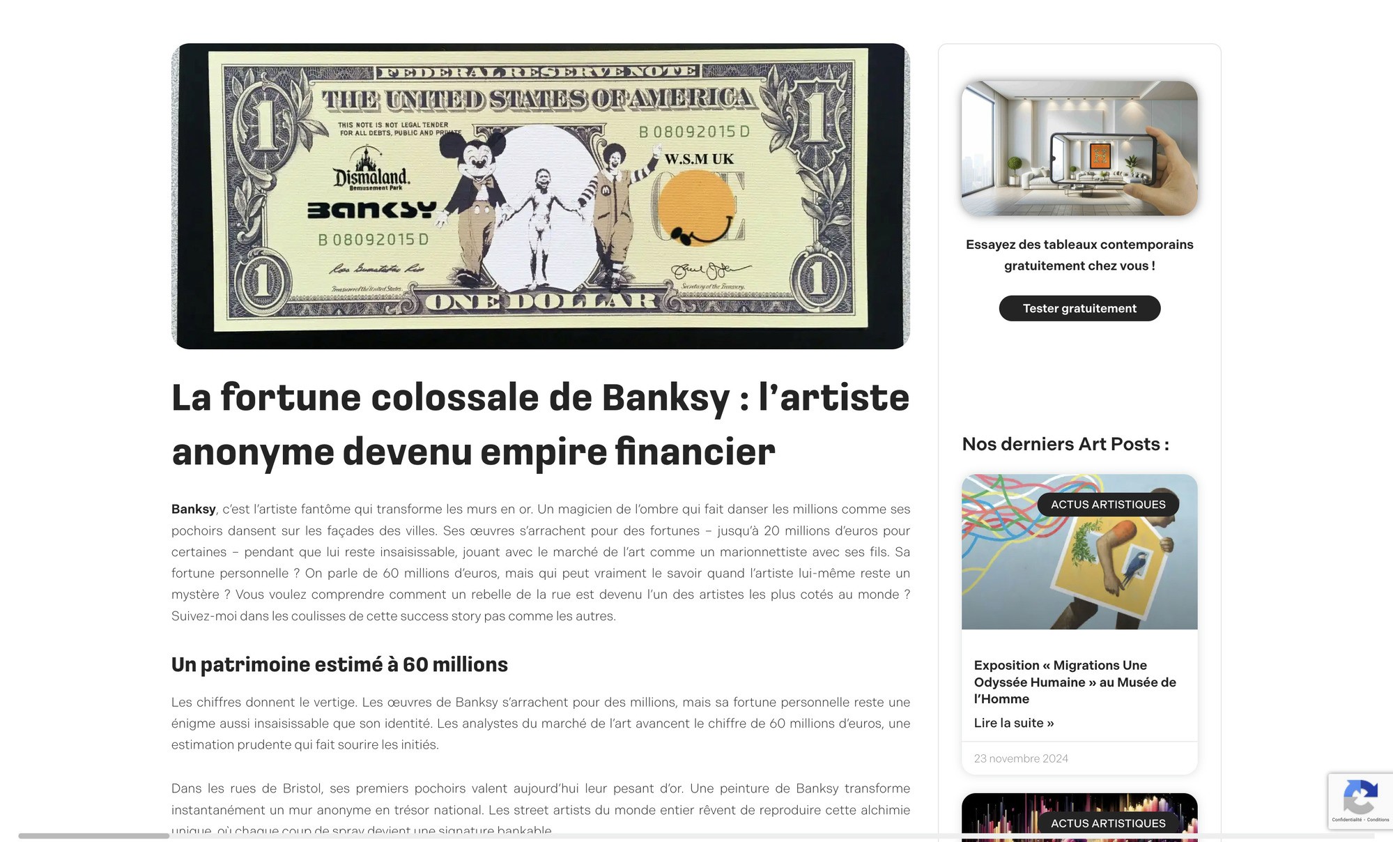 Compte tenu de l’enjeu stratégique lié au référencement naturel, nous avons également développé un écosystème éditorial complet baptisé “Art Blog” : un espace à part entière, pensé comme une extension du site, dédié à la publication d’articles sur l’art contemporain, les tendances et les artistes émergents.